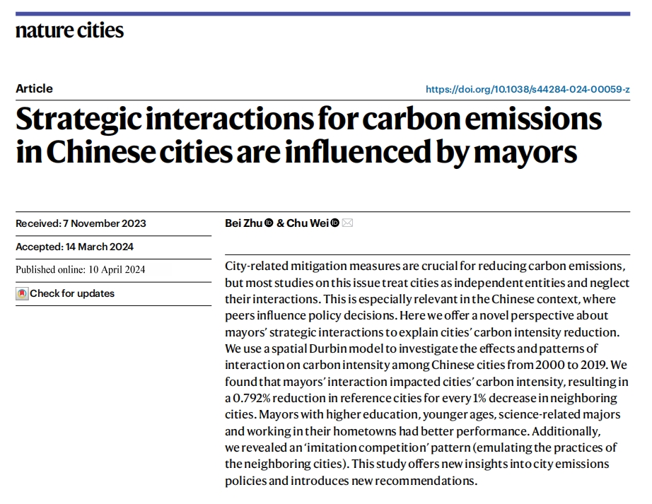 4月10日,魏楚教授团队的研究成果“Strategic interactions for carbon emissions in Chinese cities are influenced by mayors”以研究论文(Article)形式在国际学术期刊《自然·城市》杂志(Nature Cities)上发表(//doi.org/10.1038/s44284-024-00059-z)。bl腐漫 博士研究生朱蓓是论文的第一作者,魏楚教授是通讯作者。
