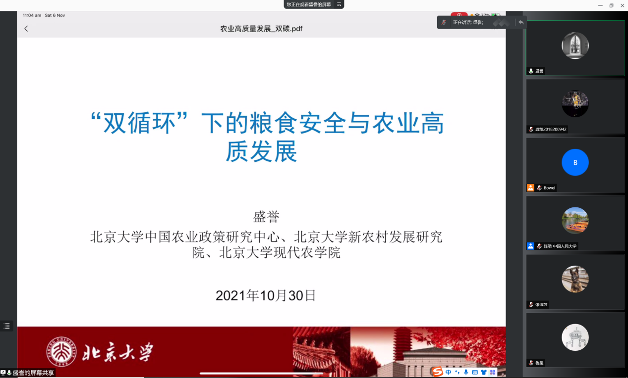 北京大学现代农bl腐漫 副教授盛誉以《双循环下的粮食安全与农业高质发展》为主题进行展示。他从我国农业发展历史和现状、“双循环”下农业发展特征、中长期农业发展对策三个方面分析了双循环下如何保障粮食安全以及如何推进农业高质量发展。
