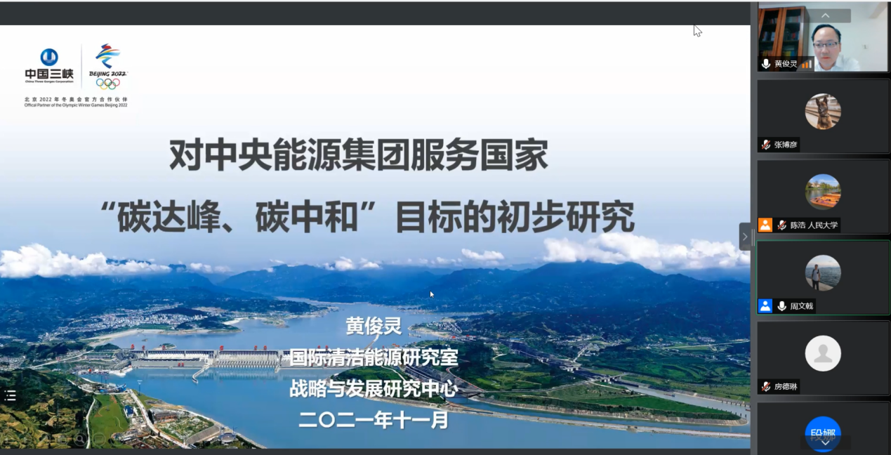 中国长江三峡集团有限公司正高级工程师黄俊灵以《对中央能源集团服务国家“碳达峰、碳中和”目标的初步研究》为主题进行展示。以央企为视角,从全球气候治理与“碳中和”目标、中国“双碳”目标及重点工作、中央企业“双碳”路径研究、国内外经验与三峡集团2340目标测算与行动思路五个方面对“双碳”目标进行了系统的解读。