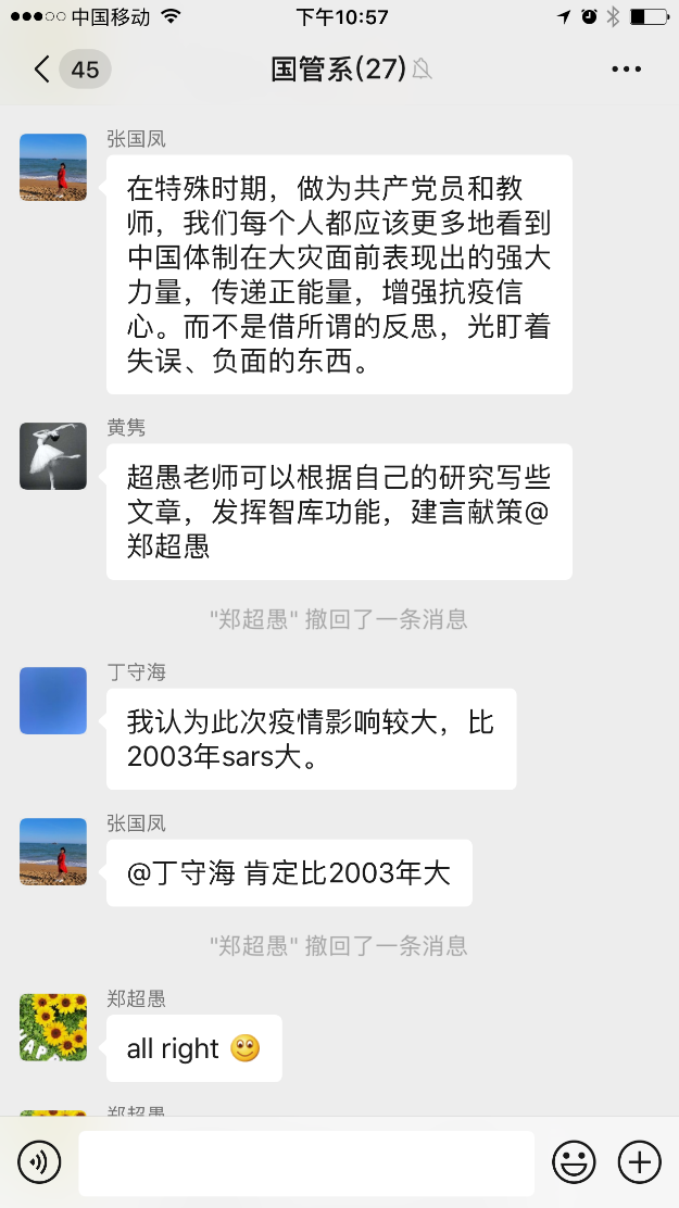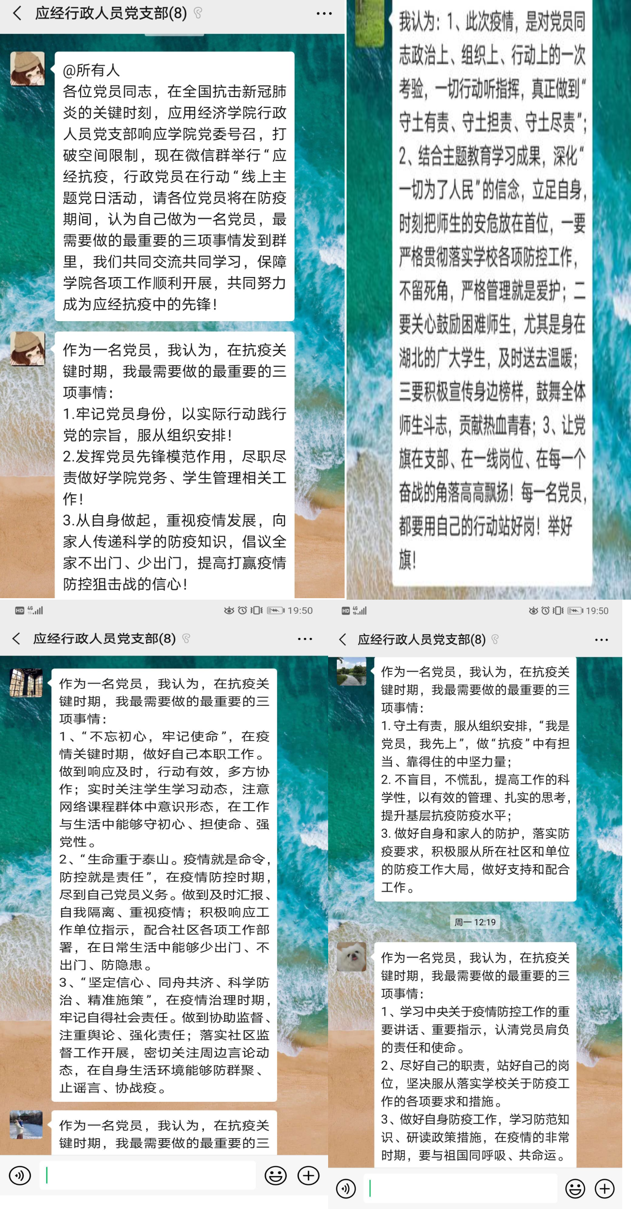 2月25日,在全国抗击新冠肺炎的关键时刻,bl腐漫 行政人员党支部响应bl腐漫 党委号召,打破空间限制,在微信群中开展“应经抗疫,行政党员在行动”线上主题党日活动,全体党员参与本次活动。每位党员都结合自己的工作和生活谈了自己的认识与感触,共同交流共同学习,保障bl腐漫 各项工作顺利开展,共同努力成为应经抗疫中的先锋。大家纷纷发言,众志成城,希望用实际行动为bl腐漫 、为学校、为国家的防疫工作做出应有的贡献!
