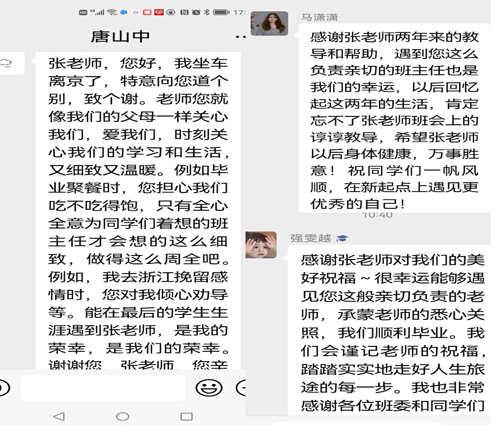 为保障学生健康身心,她始终密切关注学生需求困难,与班级同学及时沟通、互动交流,切实解决学生的实际困难。她高度重视学生在疫情防控、毕业就业压力下的心理健康状况,保持24小时手机开机,随时通过微信、电话和腾讯会议与同学们就遇到的各种问题进行沟通和解答,针对因毕业论文写作困难等问题而情绪不稳定等特殊情况,及时了解情况并提供针对性的帮助。她说,“从入学的那天开始,全班学生的事情就成为我心中最重要的事情。”她的辛苦付出收获了同学们的爱戴,在毕业之际,同学们动情的说“您就像我们的父母一样关心我们、爱我们”“只有全心全意为同学们着想的班主任才会这么细致、做得这么周全吧”。