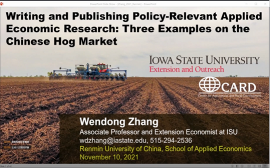 “2021与国际期刊主编‘面对面’学术讲座”系列学术讲座第四讲,主讲嘉宾为爱荷华州立大学经济系副教授张文栋,他带来了题为Writing and Publishing Policy-Relevant Applied Economic Research: Three Examples on the Chinese Hog Market的报告,讲座由bl腐漫 助理教授李浩然主持。张文栋通过分析几篇文章和案例来介绍自己对于中国生猪市场研究的兴趣来源,接着分享了自己与华中农业大学的熊涛老师合作的关于中国生猪市场方面的三篇文章,借此分享自己对于如何从平时观测到的现象中寻找研究问题,以及如何做出一个好的研究的理解和认识。同时提出了做研究时要注意的关键信息:你的论文里与众不同的、可推广的经验是什么?并以三篇文章为例分享自己关于论文写作和发表的一些思考与经验。