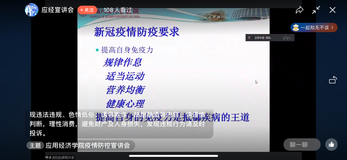 接着,汤欣院长向同学们分享了科学防疫的注意要点,她强调了个人防护的12字口诀 :“戴口罩、勤洗手、多通风、少聚集”,并播放了正确佩戴口罩及七步洗手法教学视频。除了外部防护措施之外,她还强调了自身免疫力是疫情防控的关键一环,她建议师生应规律作息、适当运动、营养均衡,通过正确的方式排遣压力,保持健康心理。在切断传播途径方面,汤欣院长强调,大家要充分认识到信息及时上报的必要性,提高防控意识、大局意识,在自身面临风险时及时上报、杜绝病毒传播。