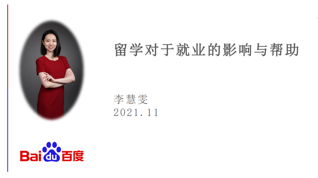 就职于百度总裁办公室的优秀校友李慧雯(2011级国民经济管理本科)因疫情防控要求通过线上形式参会。作为海归精英,李慧雯以自己为例,从生活和工作两方面介绍了自己的留学经历和收获。接着,她围绕“为何留学”这个问题进行了详细阐述,最后从如何选择学校、就业发展情况以及如何把留学所获应用于工作和生活这三个方面为大家提供建议。