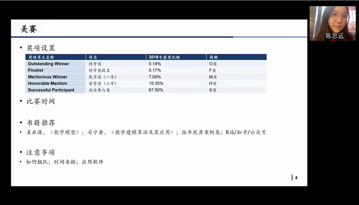 四位同学重点分享了关于国际学生竞赛的相关事宜,包括主要形式、时间安排、团队配置、所用软件、参加竞赛的原因等多个方面。同时提醒同学们要打好数学基础,尽己所能自学部分内容,善于思考,勇于试错,从目的地或起点出发,找对方向,做好学习规划。除此之外,四位同学也对本科“保研”和如何取得高学分绩等问题进行了精彩分享,其中重点介绍了“保研”时间轴安排以及专业课和选修课、数学和英语的学习方法。
