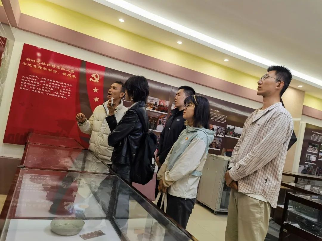 在格林村村史馆,黄家斌向来访的同学们讲述了背崩乡格林村作为边境乡村,数十年为藏地边境稳定安宁所做出的卓越贡献。1950年里氏8.6级的大地震震中便位于格林村,村庄在劫难过后仅剩四户人家。他们在新中国及藏地党组织的关怀与支持下顽强奋斗,重建振兴了新家园,新的格林村也就此与新中国紧密相连。近年来,格林村以军地共建为抓手,结合“边境四红工程”,集合军地资源,发挥各自比较优势,结合军地党组织推广“五共五固”,凝聚工作合力,开创了基层党建、产业发展、乡村振兴、维护稳定、守边固边新局面。