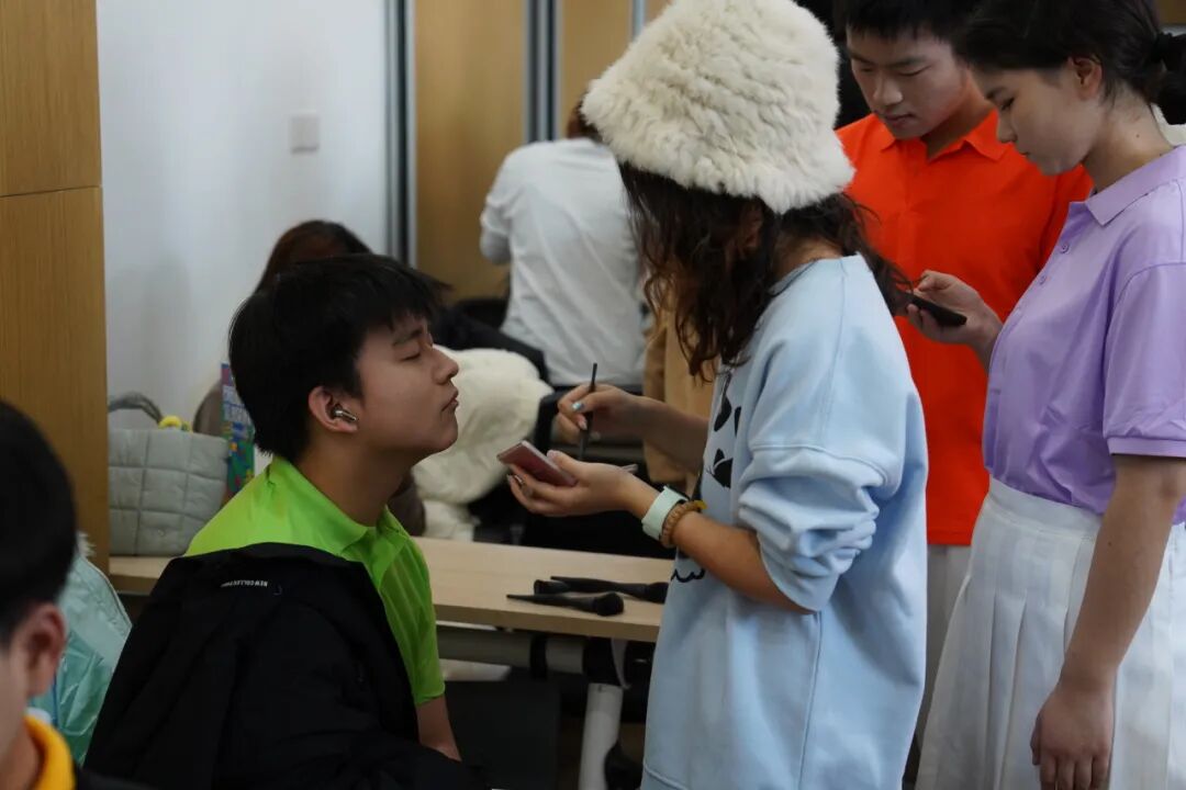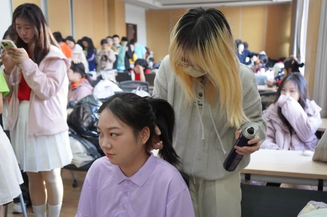 当日上午九点,参与展演的同学们齐聚明商407教室,来自三个bl腐漫 的志愿者们为70多位即将登台的同学们精心修饰妆容。经过数个小时紧张而有序的化妆工作,同学们都以最佳状态做好了上台前准备工作。