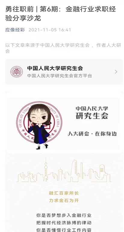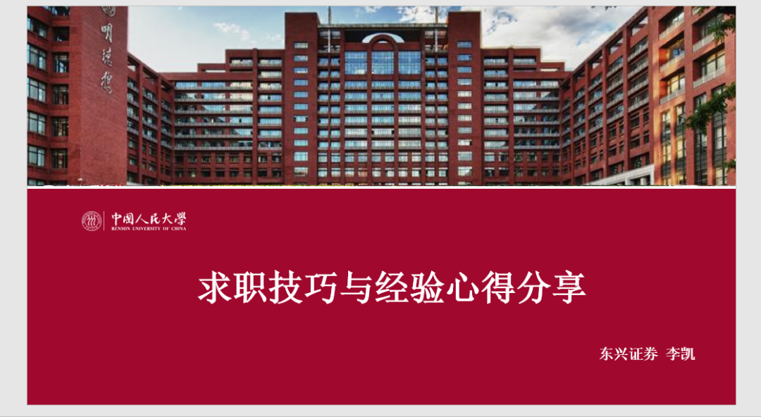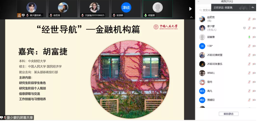 邀请现就职于某头部券商投行部门的2018届国民经济学校友胡富捷、现就职于中国进出口银行总行的2019届国民经济学校友兰弓煜、现就职于东兴证券投资银行部的2021届国民经济学硕士校友李凯,分别就各类金融机构的主要业务内容范畴和工作情况、就券商简历准备、岗位内容、实习留用和笔面试准备等内容展开分享。