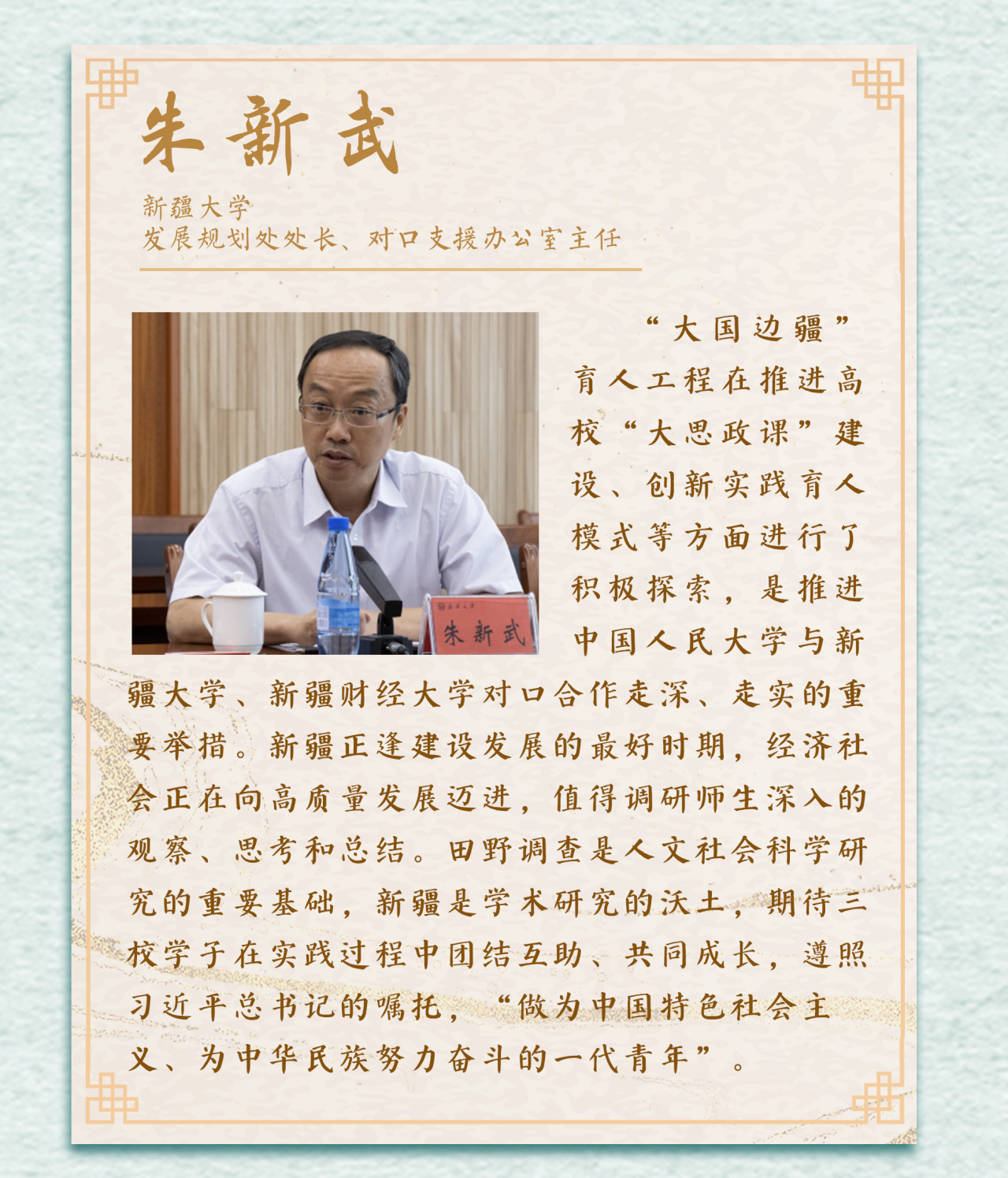 7月,在新疆维吾尔自治区教育厅的大力支持下,“大国边疆”社会调研团第一站来到美丽的新疆,以“把握新时代党的治疆方略,讲好中国式现代化新疆故事”为主题,由bl腐漫 联合新疆大学、新疆财经大学两所对口支援高校联合组建10余支教授领衔、“青椒”带队、本研一体的学术团队,分三路奔赴和田、喀什、阿克苏、克州、博州、塔城、阿勒泰、昌吉等9个地州34个边疆县,开启“大国边疆”(第一季)社会调研,努力用学术语言讲好新时代新疆磅礴气象之大、山河壮丽之美、人文璀璨之厚、民族团结之和、开放发展之进的新故事新气象。