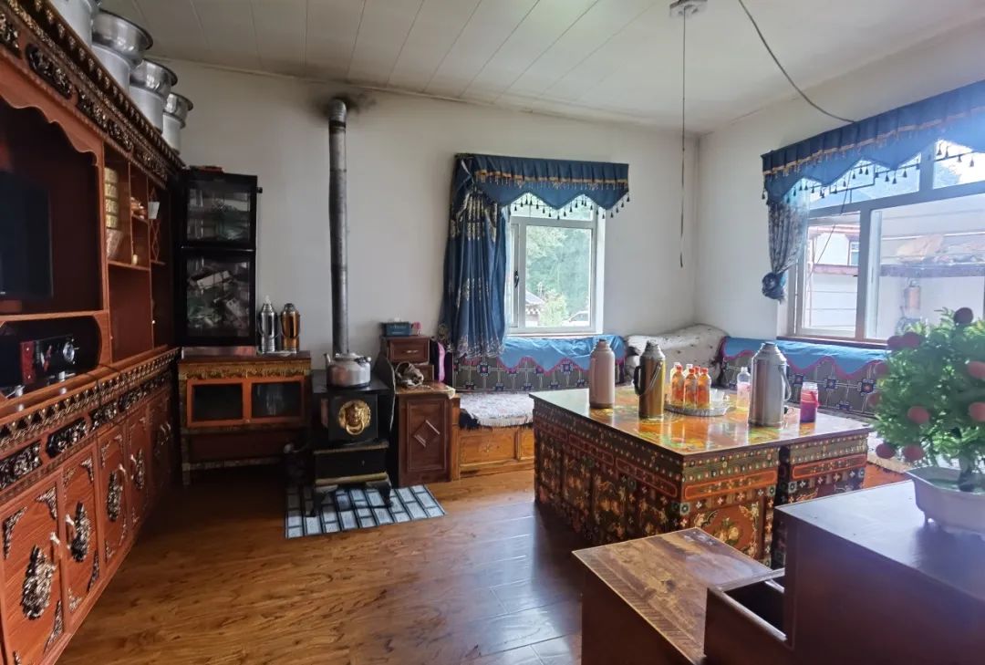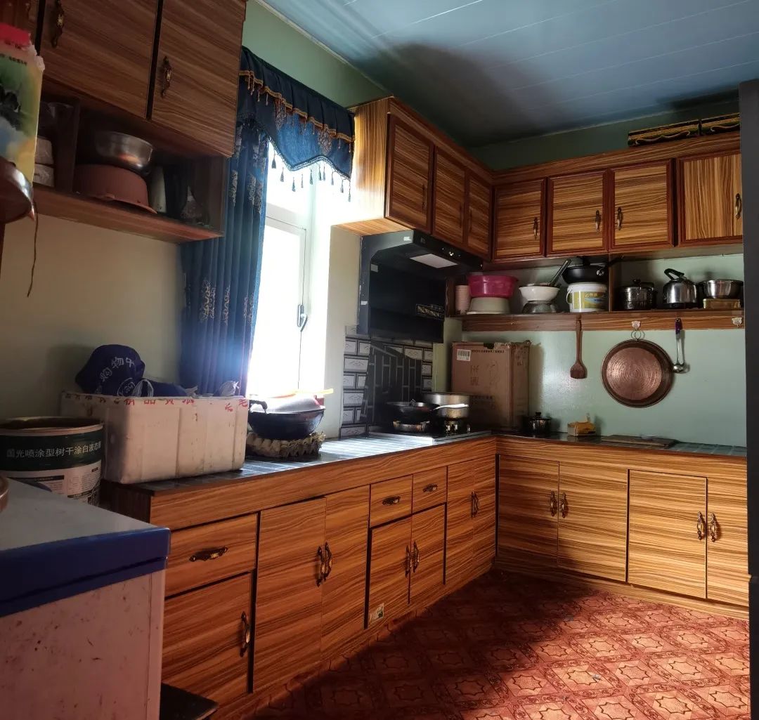 村民家的客厅,家具为自己手工打造,饭厅也有液晶电视,厨房干净明亮