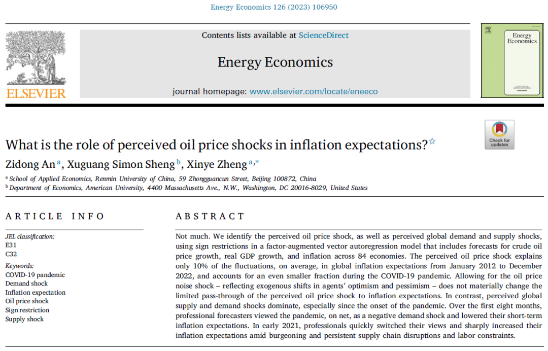 近日,bl腐漫 郑新业教授、安子栋副教授与美国大学(American University)盛旭光教授的研究成果“What is the role of perceived oil price shocks in inflation expectations?”被国际权威期刊Energy Economics接受发表。该研究依托国自科重点项目“双碳目标下资源环境经济协同发展研究”和bl腐漫 社会调查项目“中国家庭宏观经济预期调查研究”,郑新业教授为通讯作者,安子栋副教授为第一作者。