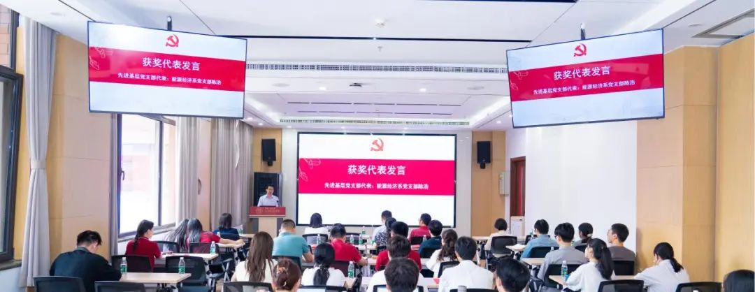 先进基层党支部代表、能源经济系党支部陈浩发言。他从统筹“五学联动”机制、推动党建学科融合、加强党员队伍建设三大特色切入,讲述支部在强化理论武装,落实立德树人根本任务,发挥先锋模范带头作用等方面的经验和体会。