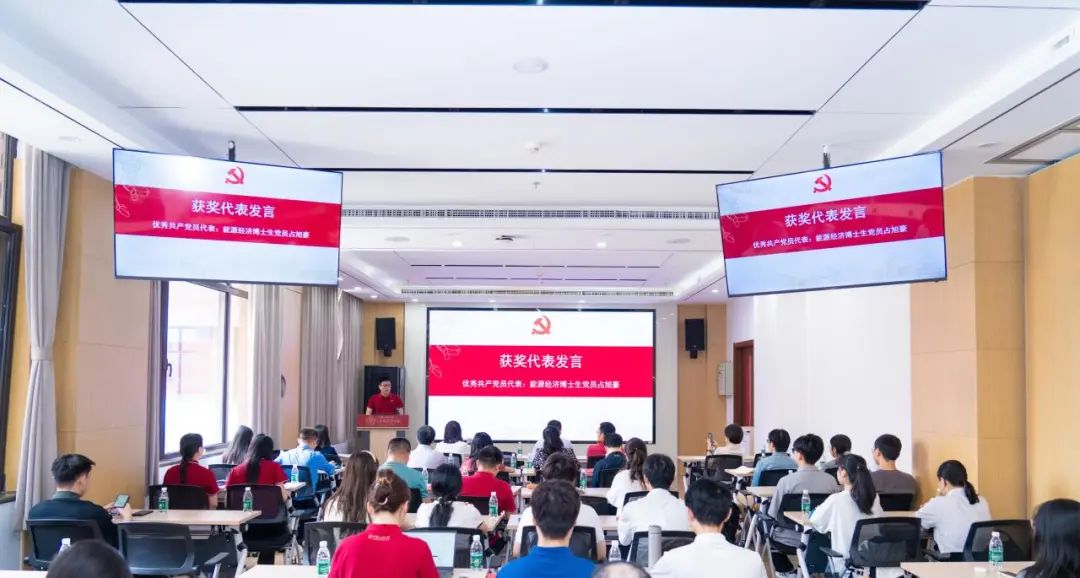优秀共产党员代表、能源经济博士生党员占旭豪发言。他从“坚定理想信念”“培养良好作风”“加强调查研究”三个方面分享感悟,表示要进一步传承红色基因、赓续红色血脉,立大志、明大德,当先锋、作表率。