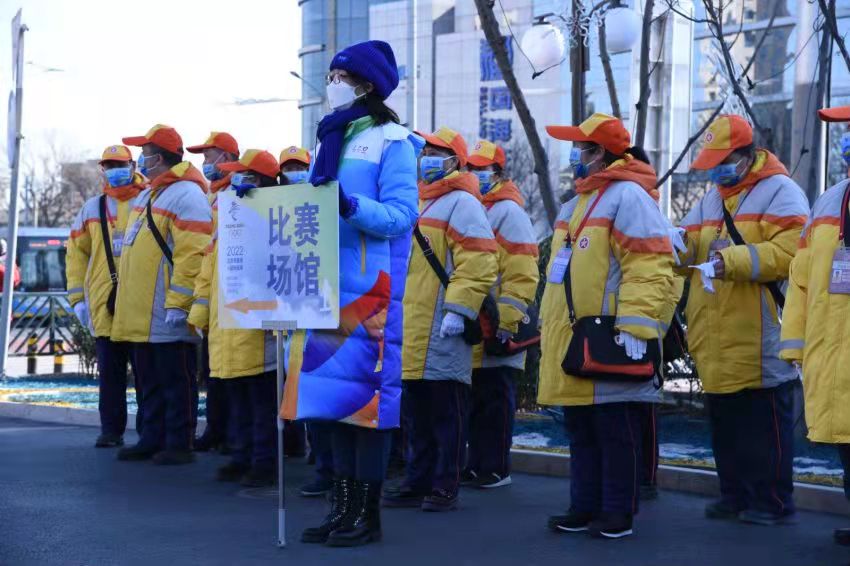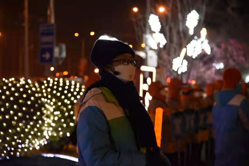 我们的工作内容主要是在首都体育馆周边引导观众入场和散场。从中外交流大厦的下车点到首都体育馆南门安检口之间大概一公里的距离。上一座天桥,路过国家图书馆和紫竹院公园门前,再走一个地下通道,观众们在文明引导员和城市志愿者的引导下有组织地行进,沿途星星点点布满城市志愿者,他们引导着前进的方向,同时也朝气蓬勃地为路过的人们送上这座城市冬日里一声温暖的问候。就像那首冬奥宣传曲的歌名——《燃烧的雪花》,虽在冬日,有漫天大雪,有瑟瑟寒风,但每一位志愿者都似一片努力燃烧的“小雪花”,一点点微弱的光与热汇聚起来,温暖着这座“双奥”之城。