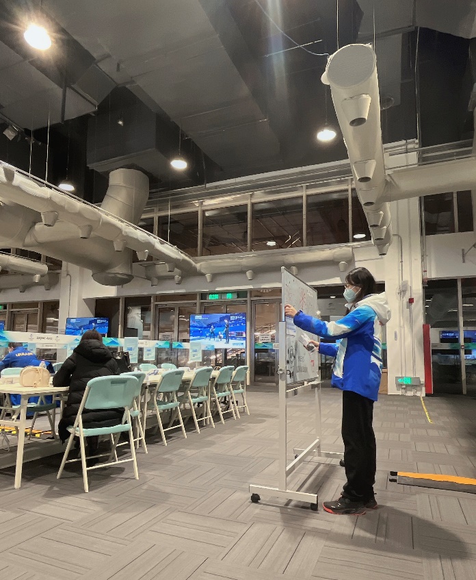 冬奥期间,我在媒体运行领域的MPC媒体工作间工作,主要负责媒体工作间服务台咨询问答,记者工位、打印机、媒体休息区等设施设备检查,根据新闻发布会和比赛转播计划调整电视机和电视墙频道等工作。媒体工作间作为记者办公的公共空间,在赛时会实时转播所有比赛,我们工作间助理会为记者提供24h的服务,记者人数最多的时候达到200余人,凌晨也常有记者在这里辛苦工作。
